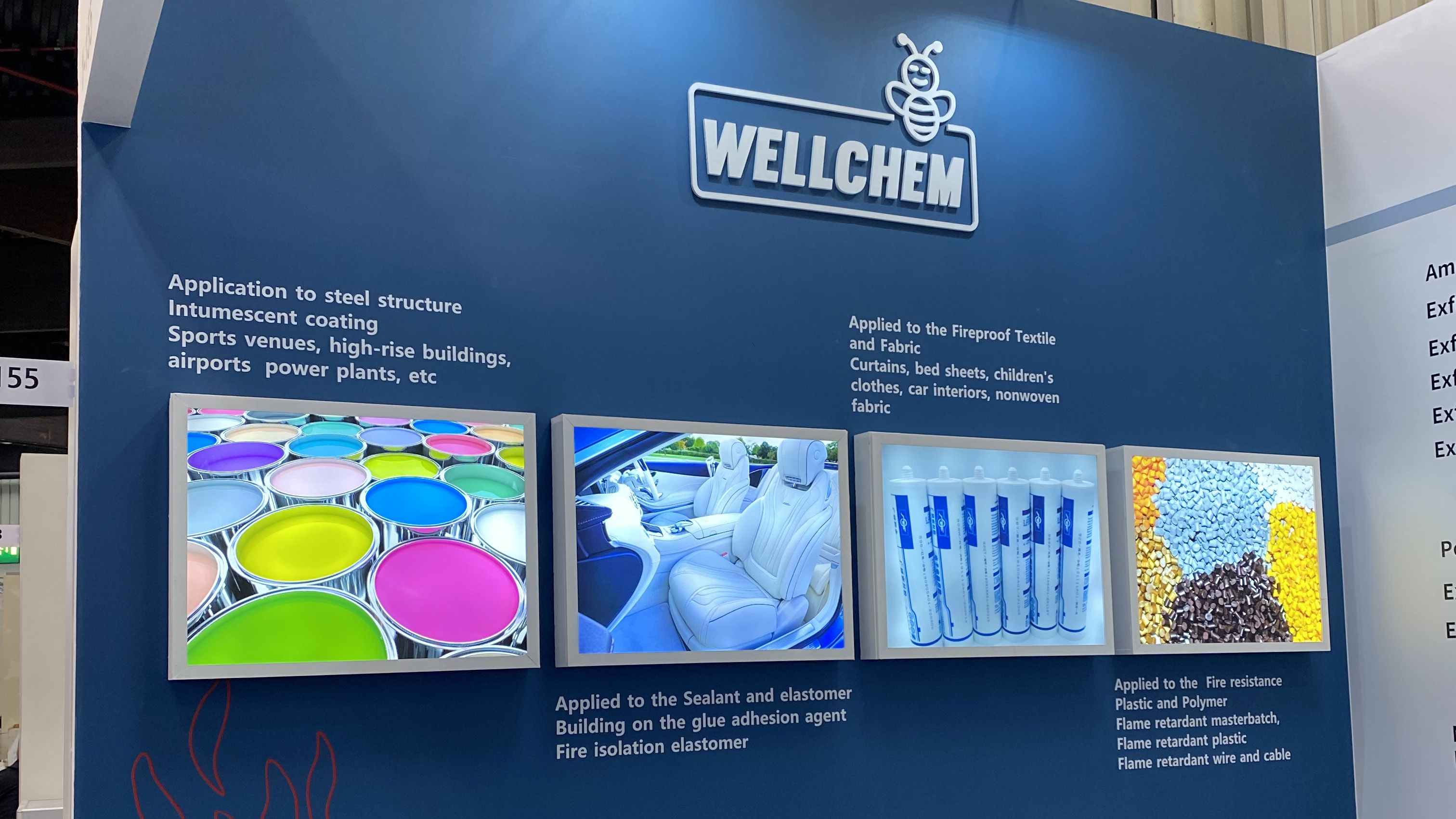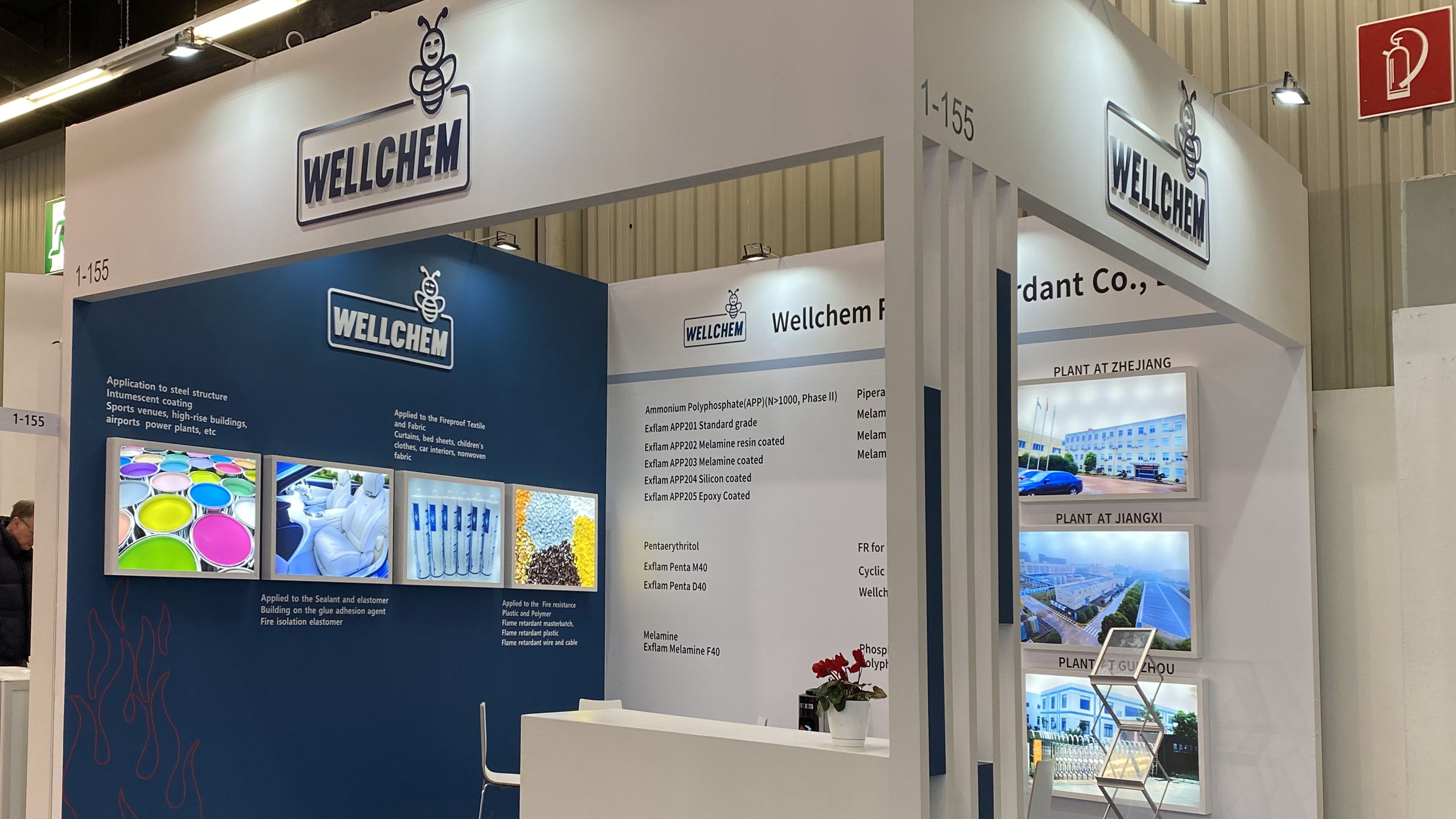 衢州衛(wèi)凱化工有限公司位于國家循環(huán)經(jīng)濟(jì)示范基地衢州綠色集聚園區(qū),園區(qū)內(nèi)有巨化集團(tuán)等著名化工企業(yè),為園區(qū)內(nèi)企業(yè)提供豐富的基礎(chǔ)化工原料和各類化工專業(yè)人才。衢州衛(wèi)凱化工有限公司是繼德國Clariant和Budenheim之后世界第三“結(jié)晶II型高聚磷酸銨(n>1000)”的生產(chǎn)和服務(wù)商,在膨脹型防火涂料,塑料,紡織阻燃劑等領(lǐng)域具有重要的國際市場地位。公司獨(dú)立開發(fā)和生產(chǎn)的(烷基)次磷酸鹽系列產(chǎn)品和三嗪類成炭劑是目前最前沿的革新產(chǎn)品,為了緊隨德國Clariant和意大利Italmatch致力于推動市場發(fā)展,衛(wèi)凱化工在展臺設(shè)計(jì)搭建方面也確實(shí)下足了功夫。