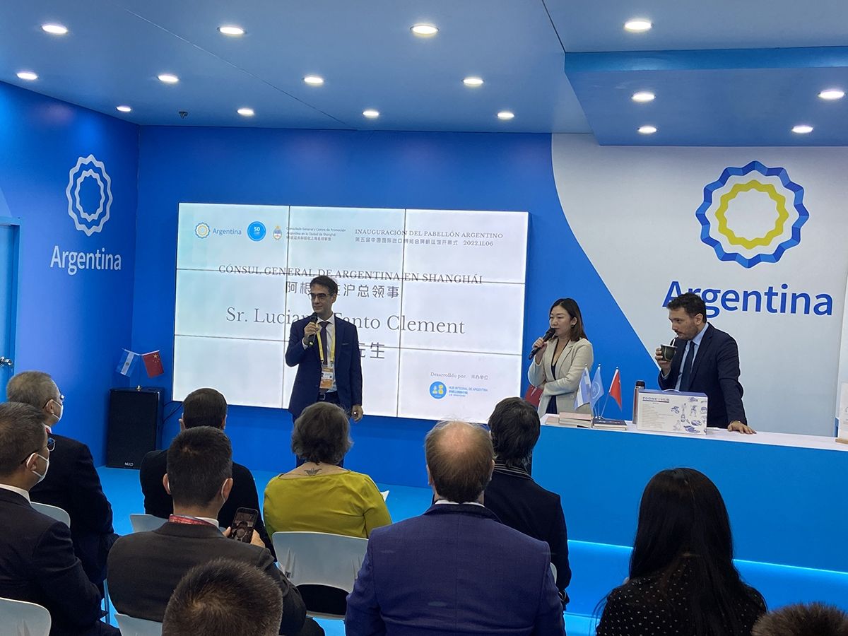 上圖:中勵展覽為阿根廷在進(jìn)博會中設(shè)計(jì)搭建的展臺活動現(xiàn)場