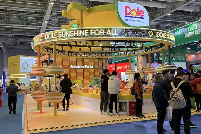 上圖:都樂(lè)食品展臺(tái)設(shè)計(jì)中將重點(diǎn)產(chǎn)品的展臺(tái)設(shè)計(jì)使用了代表企業(yè)的黃色來(lái)突出重點(diǎn)展示區(qū)域。
