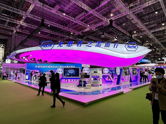 上圖:羅氏展臺(tái)設(shè)計(jì)效果采用了紫色、藍(lán)色、白色相結(jié)合的豐富色彩,配上變色燈光的應(yīng)用,讓色彩更加豐富。